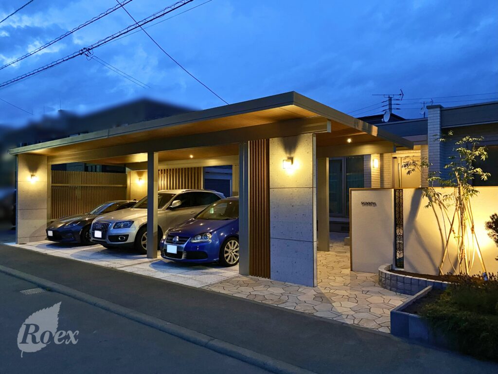 3台用分駐車スペース+アプローチにカーポートを使用したデザインのご提案です。ダウンライトやウォールライトは雪に埋まる心配がなく、冬でも安定して外構やカーポート周りを照らせます。雪国でも夜の雰囲気を存分に楽しめるプランニングとなります。