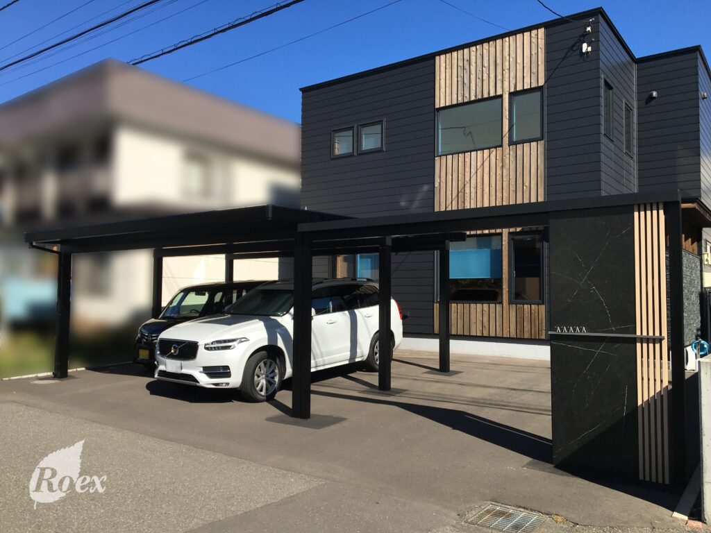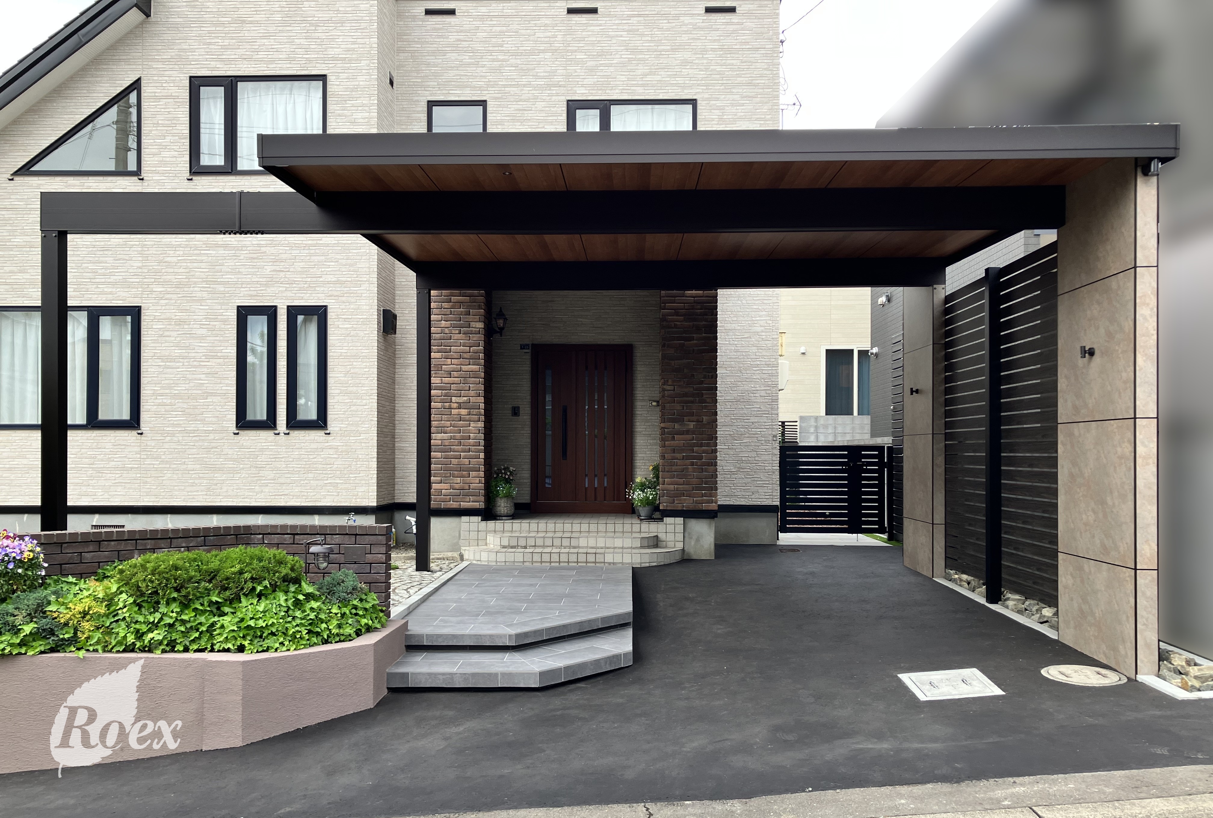 2台用カーポートを配置した現場です。雪や雨から車を守る機能はそのままに、目隠し効果とデザイン性を両立させ、無機質になりがちなカーポートが洋風住宅にも自然に馴染む外構の主役となりました。