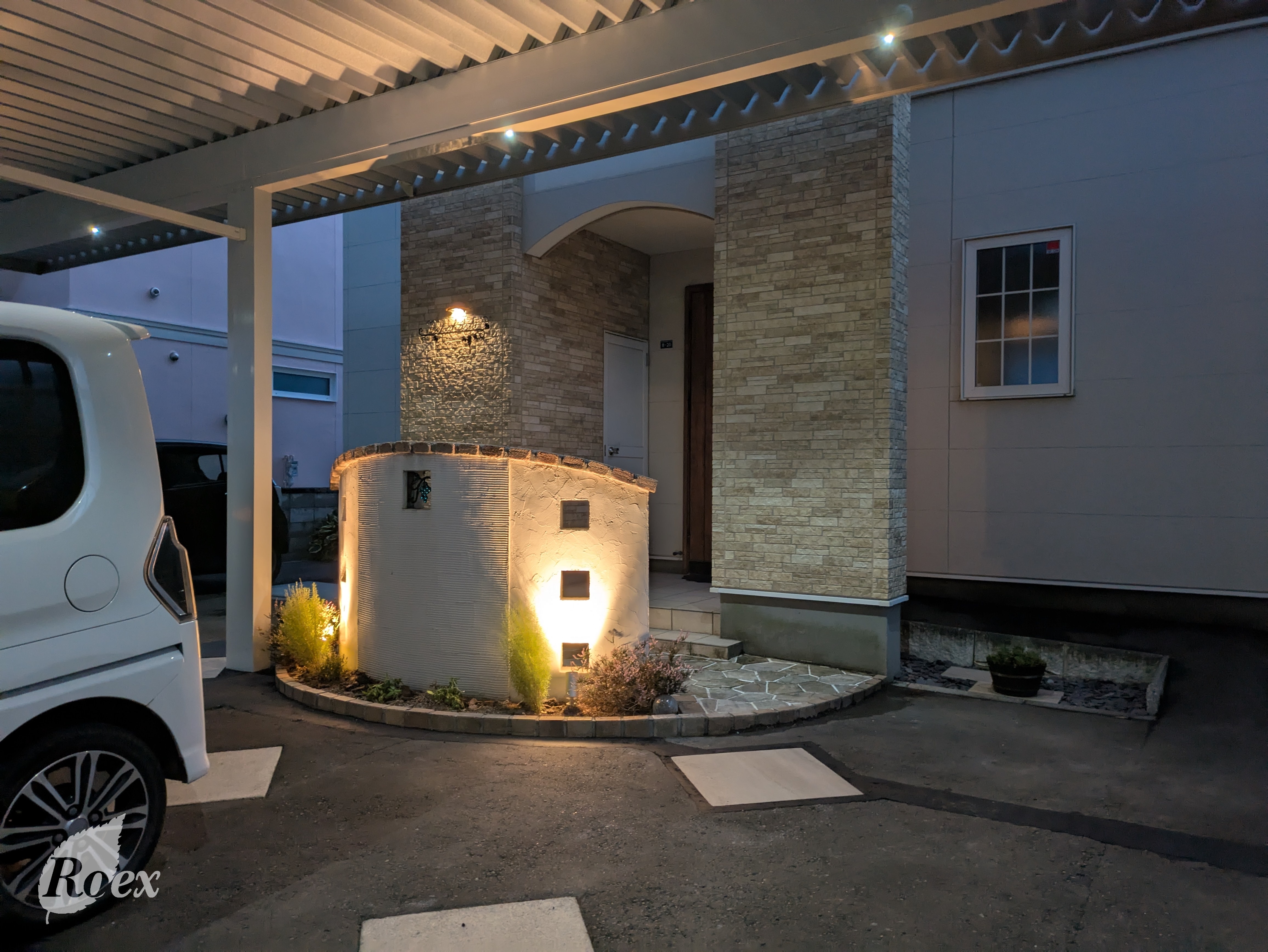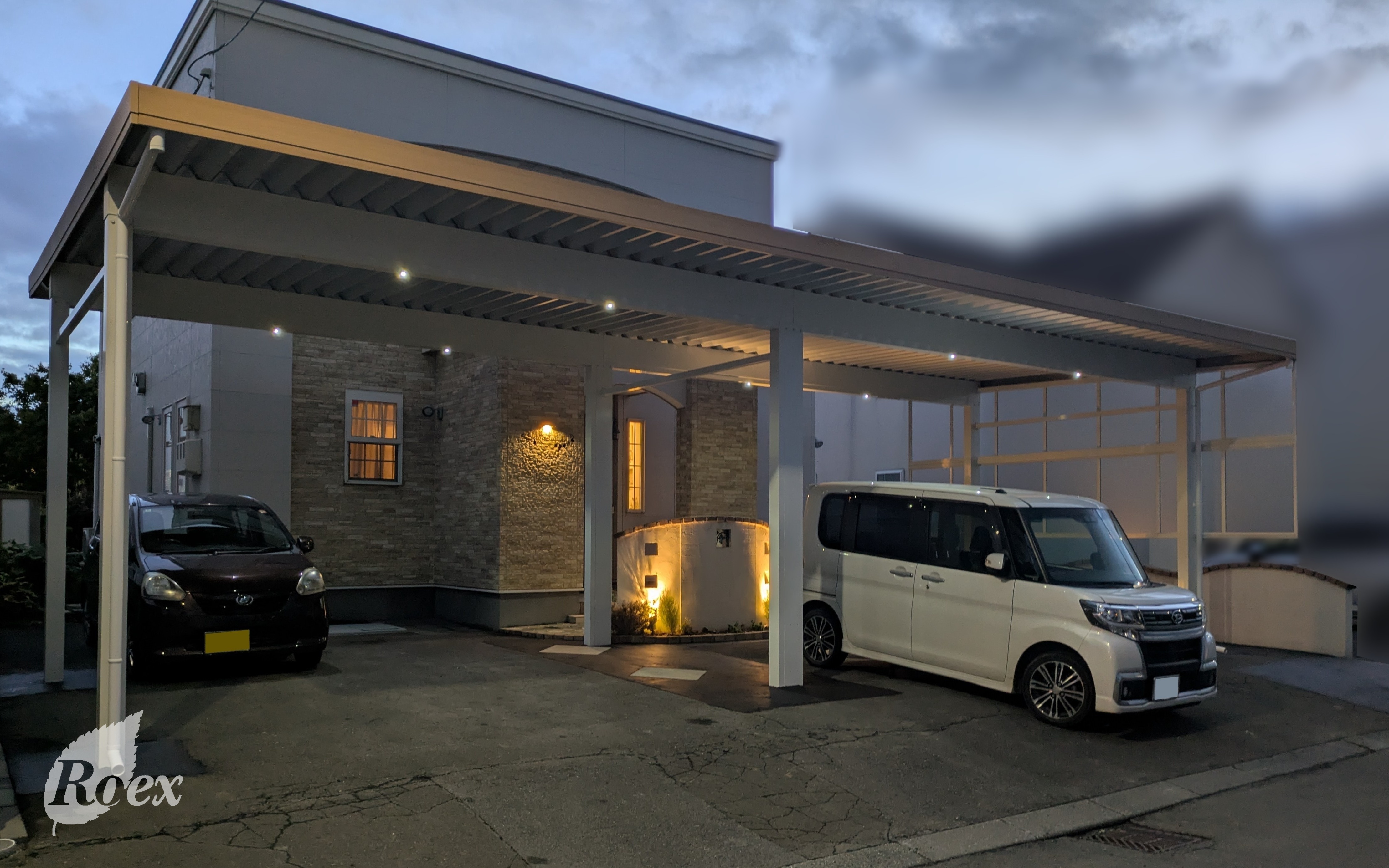 カーポートにダウンライトを設置し、夜間の利便性と外観に上質さがプラスされ昼間とは違うナイトシーンを楽しめる空間に仕上がっています。
