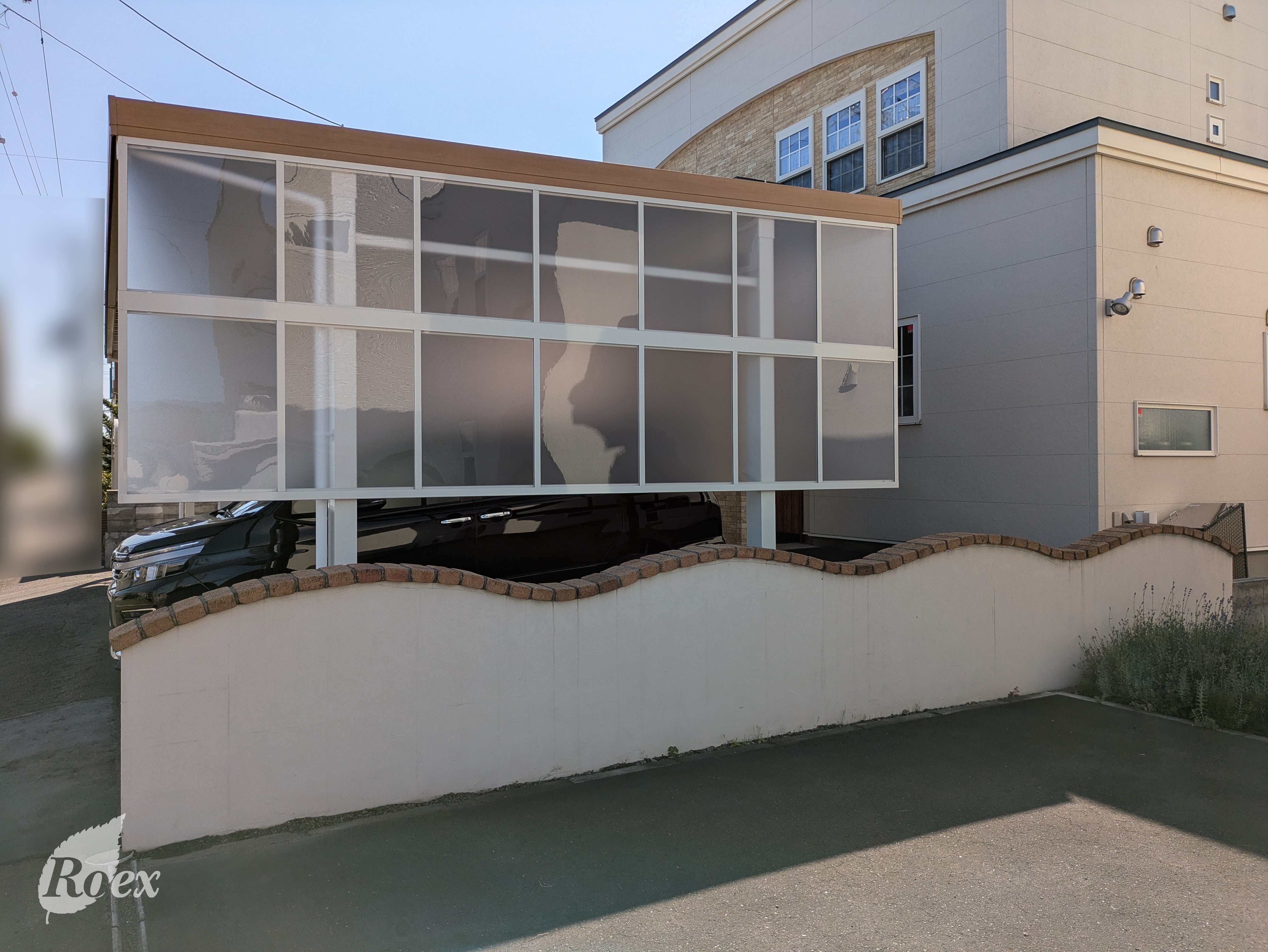 横からの雪の吹き込みを軽減するサイドパネルは、状況に応じてパネル枠の段数や取付位置をお選びいただけます。今回は既存の塗り壁塀があるため、上部からの吹き込みを防ぐ目的で、2段分のパネルを取り付けました。