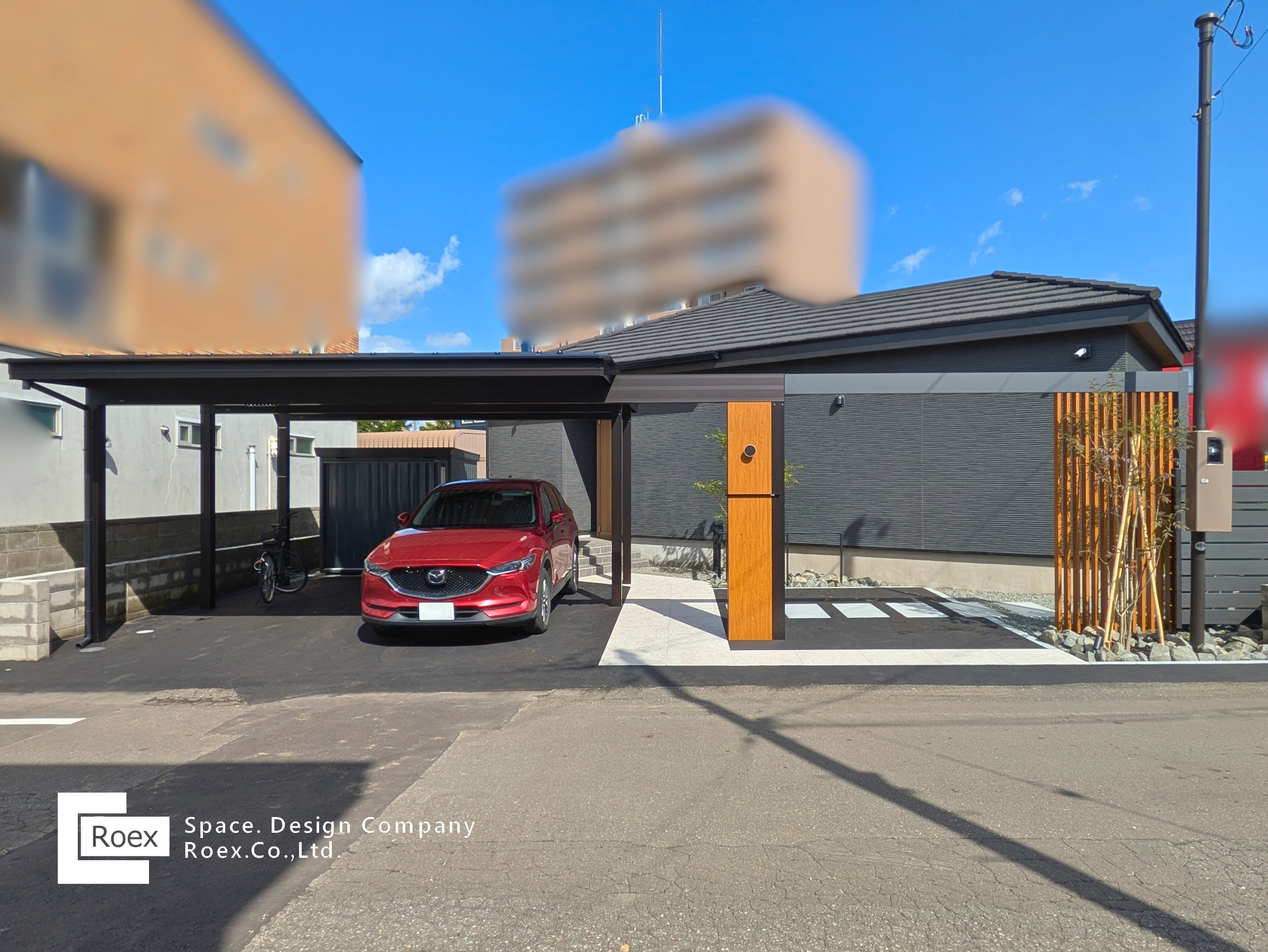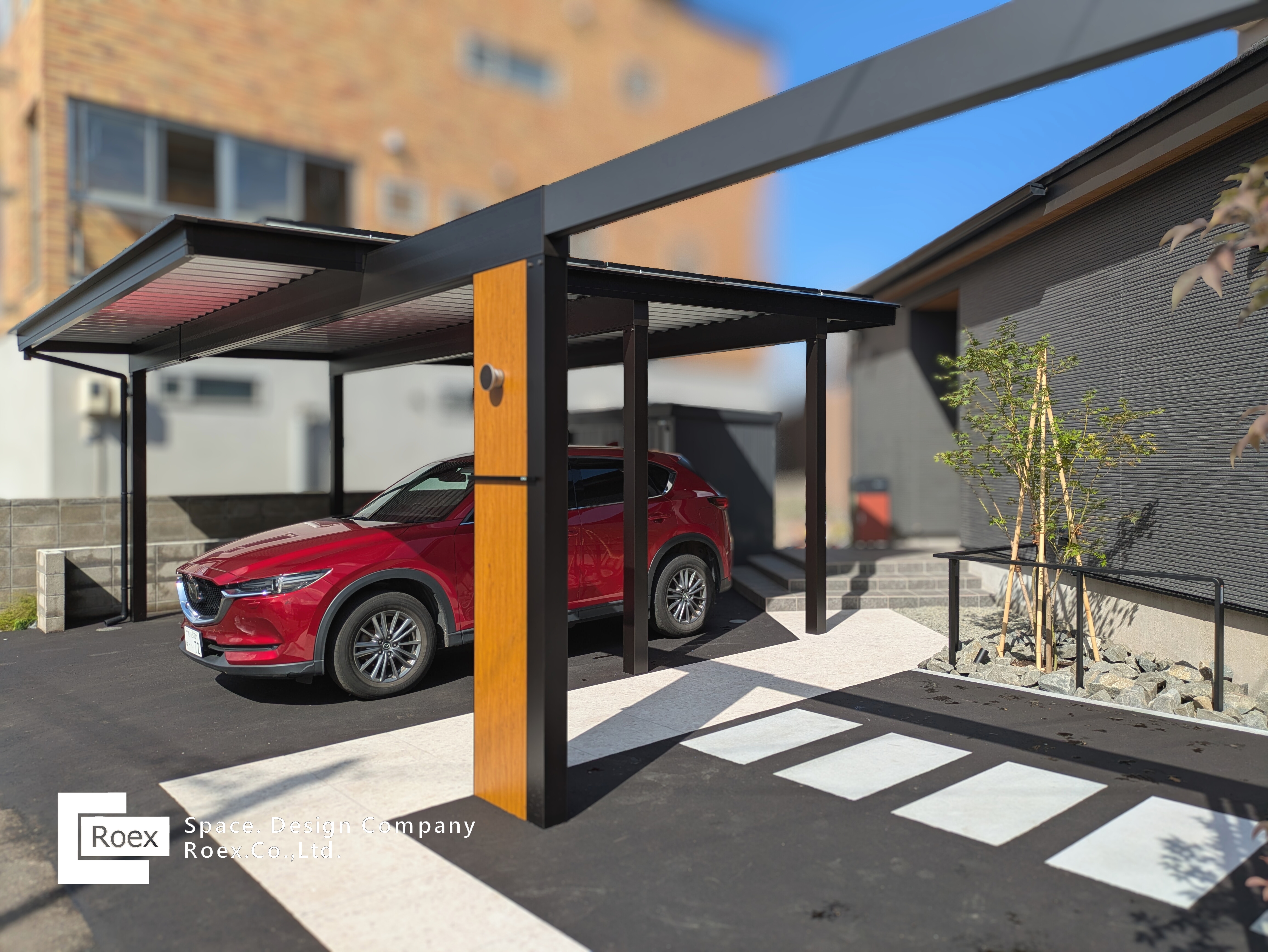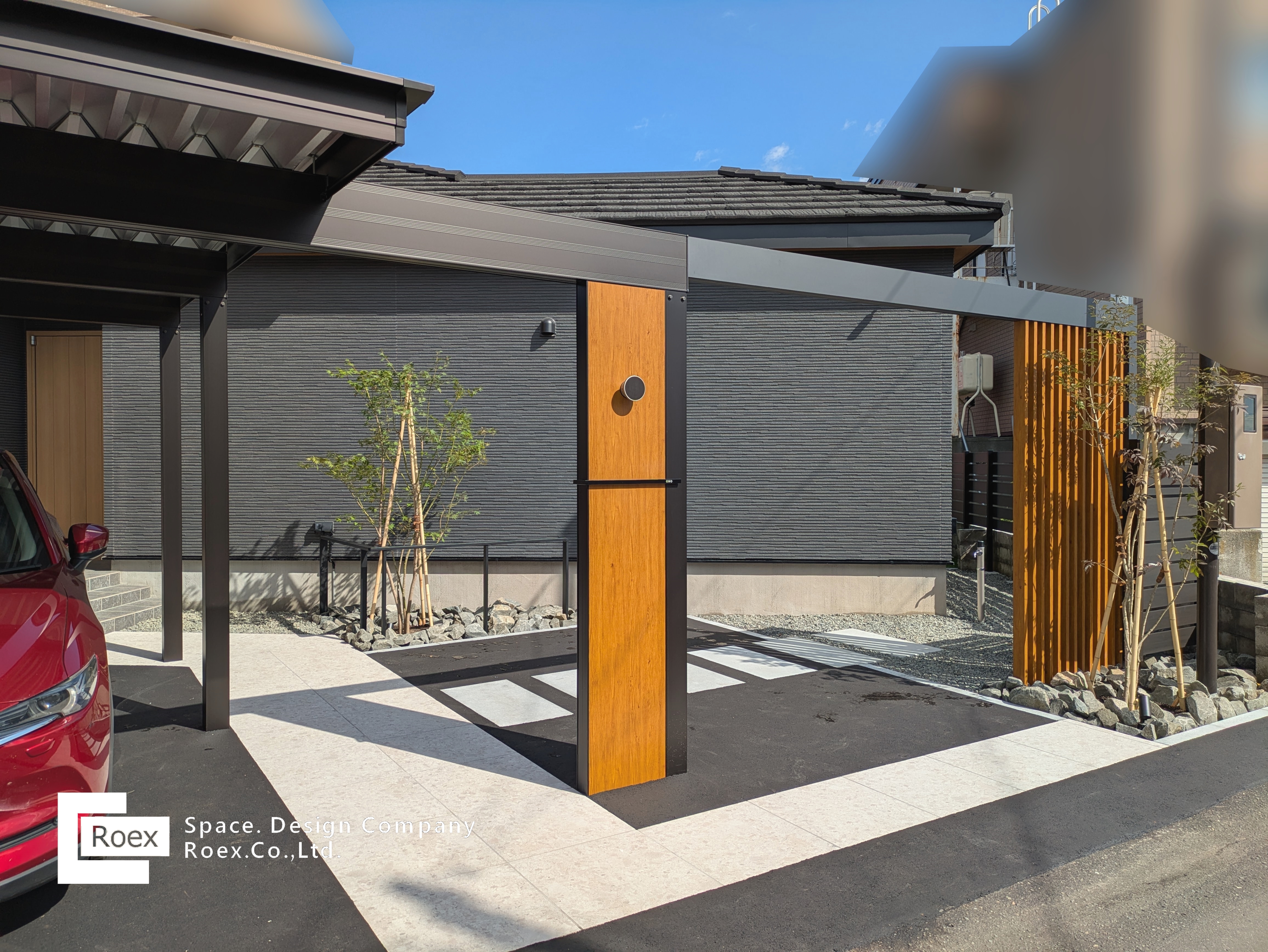 タカショー ホームヤードルーフを使用、カーポートとラインを揃え、建築と一体感のあるエントランス空間を演出。