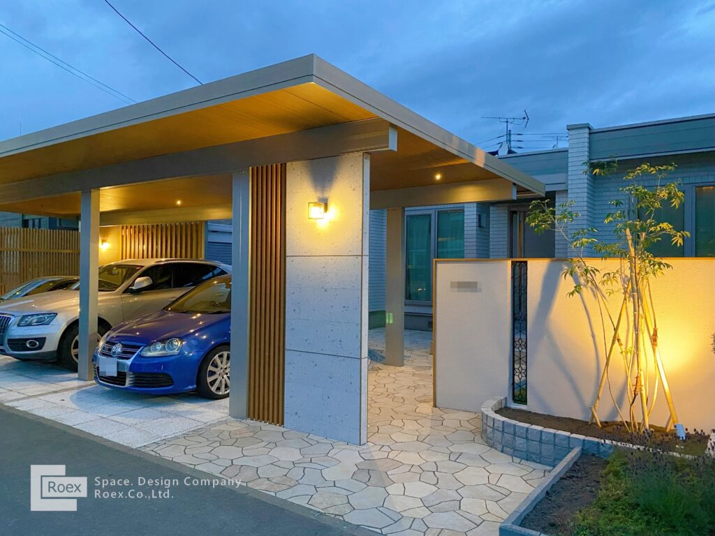 札幌市北区 昼夜で表情が変わるモダン外構 ― ライトアップが映えるカーポート付きエントランス