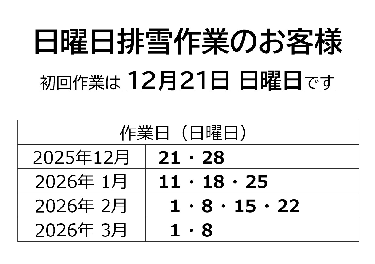 ・大雪や雪堆積場の閉鎖等で作業日が延期になった場合、また、従業員感染症等による作業日の延期についてはお電話でのご連絡は行いませんので予めご了承くださいますようよろしくお願い申し上げます。